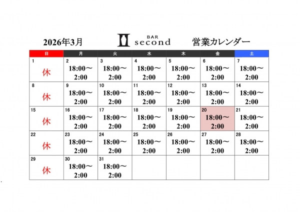2026年3月のお知らせ 2026-03-02 08:56:58 こんにちは。 名駅 バーセカンド 高見です。暖かく、花粉が飛び始めました…(T-T)毎年この時期ボーッとしてしまいます。2026年3月のお知らせです。【2026年3月】定休日 各日曜日※20日(春分の日)は通常通り営業いたします。以上の日程と致します。よろしくお願い申し上げます。バーセカンド 高見 その他状況により急遽予定を変更する場合がございます。 ホームページ、Facebook、Googleプレイス、など 各種SNSでも掲示致しますので、 お手数ですがご確認頂けましたら幸いでございます。バーセカンド BAR second 450-0002 名古屋市中村区名駅三丁目24-8 三立ビル5階 HP https://www.bar-second.com TEL/FAX 052-583-0880 OPEN 18:00 CLOSE 2:00 定休日 日曜日 #名駅 #名駅バー #名駅三丁目 #バー #bar #バーセカンド #愛知県 #名古屋市