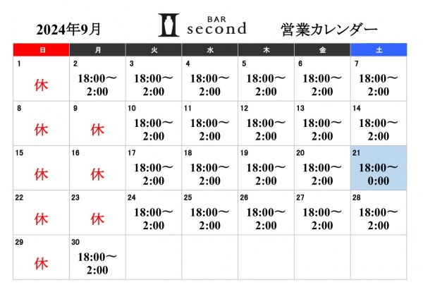 こんにちは。名駅 バーセカンド 高見です。本日9月19日(金)は18:00〜24:00と営業時間を変更して営業致...
